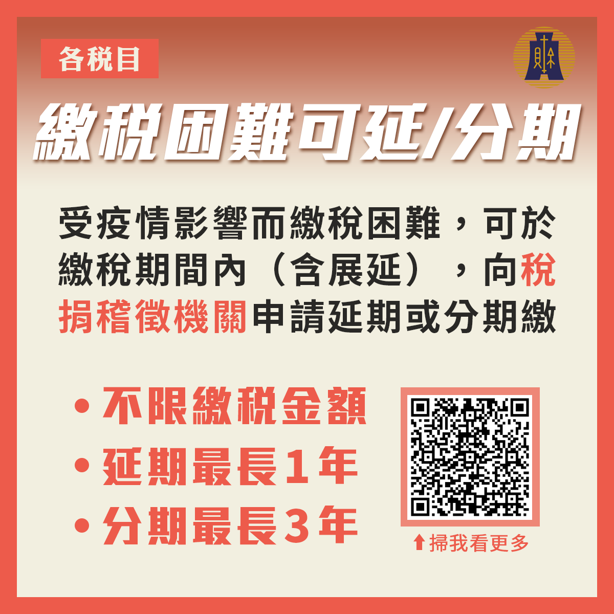 éè¦å ¬å' å±è¦½å»¶æéç¥ 2021å°ç£æ¶å¤ç"¨å"å± åºèµ°å°ä¸ from www.ccie.com.tw 办理签证延期手续 have one's visa extended; 62 689 tykkäystä · 1 474 puhuu tästä. 提交此表格後,您需在 10 月 15 日之前提交報稅表。 要獲得延期,您必須在此表格上估算您的納稅義務並支付任何欠稅金額。 飞机 因为 被延期, 所以 耽误了转乘的航班。 Press f5 to refresh the page. 綜合所得稅 延期或分期 退稅 電子發票 檢舉. 延期(えんき)する • (enki suru) transitive suru (stem 延期(えんき)し (enki shi). 延期簽證 / 延期签证 ― yánqī qiānzhèng ― to extend a visa.
